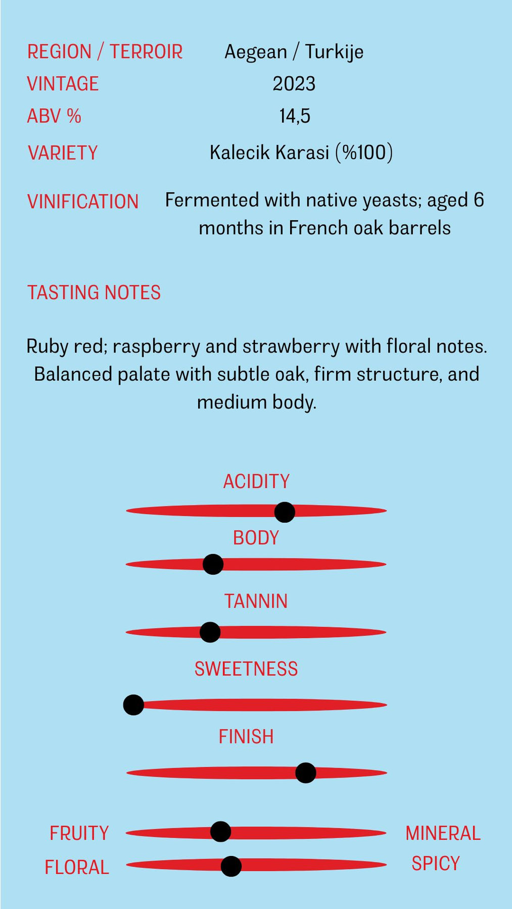 Made from 100% estate-grown Kalecik Karası, a native Turkish variety. Fermented with native yeasts and aged for 6 months in French oak barrels.