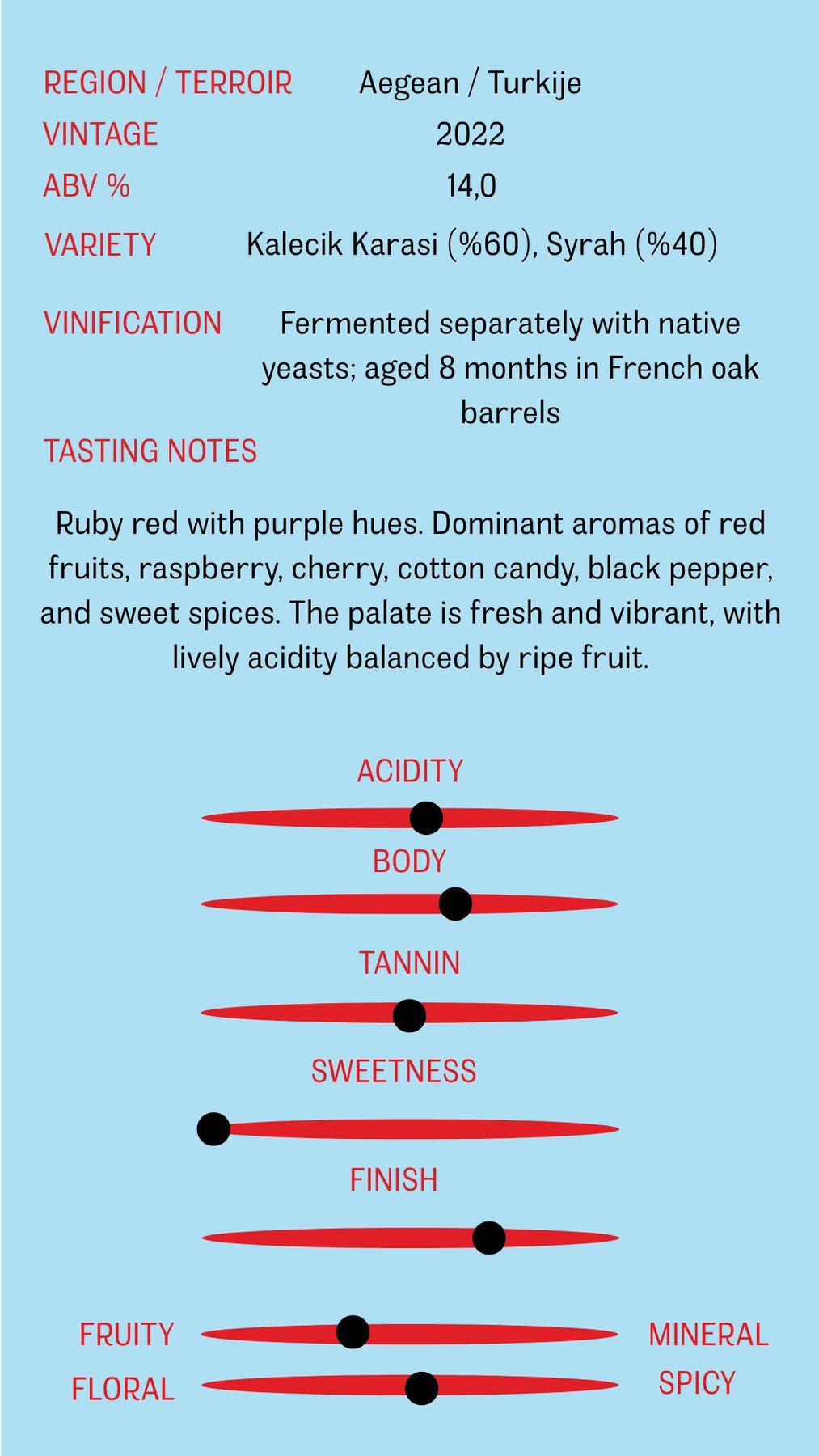 A blend of estate-grown Kalecik Karası (60%) and Syrah (40%). Fermented separately with native yeasts and aged for 8 months in French oak barrels.